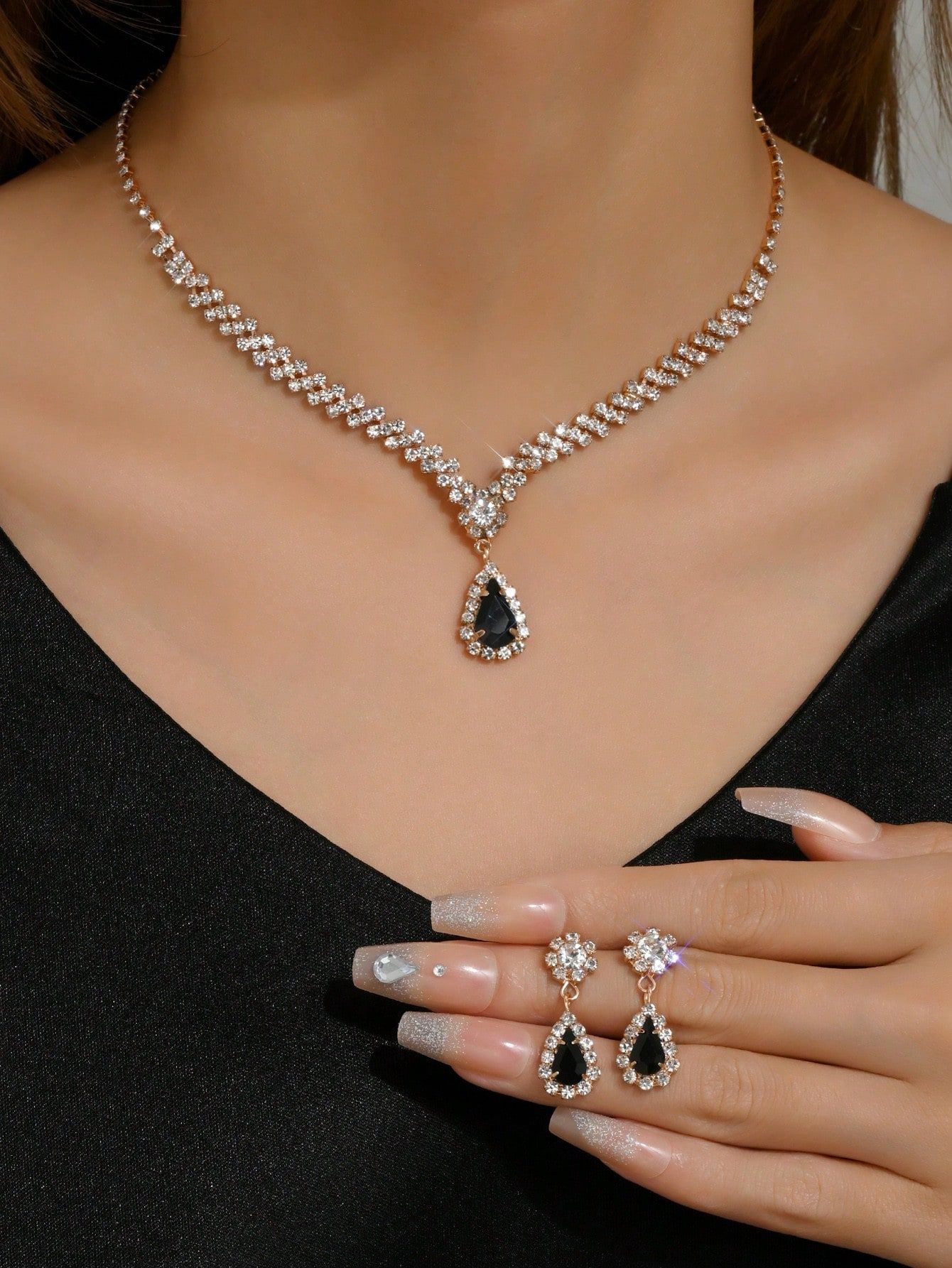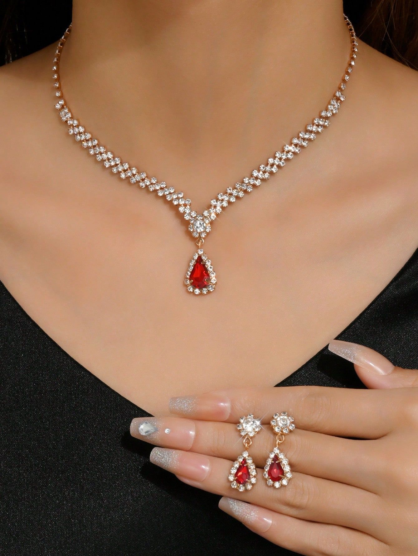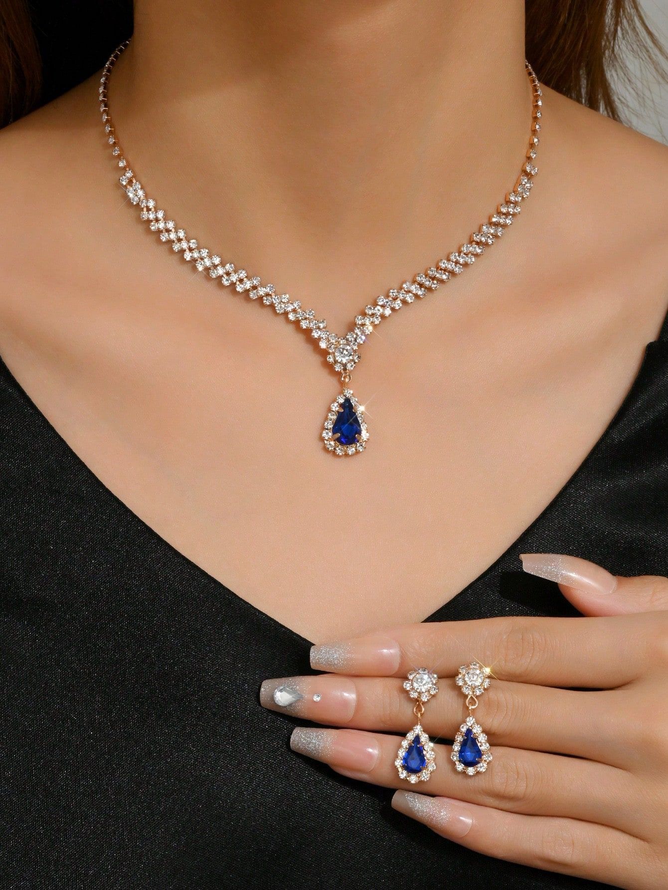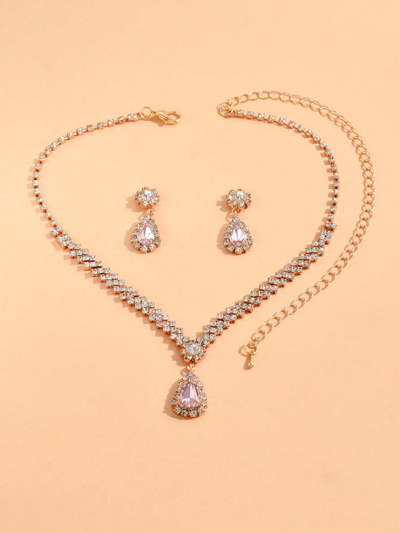 مجموعة مجوهرات للعروس باللون الذهبي عبارة عن قلادة وحلقان مرصعة بالكريستال وحجر الراين اللامعة مكونة من 3 قطع (2 حلق و1 قلادة) تصميمها مناسب للمناسبات الرسمية والاحتفالات الخاصة بالنساء والفتيات