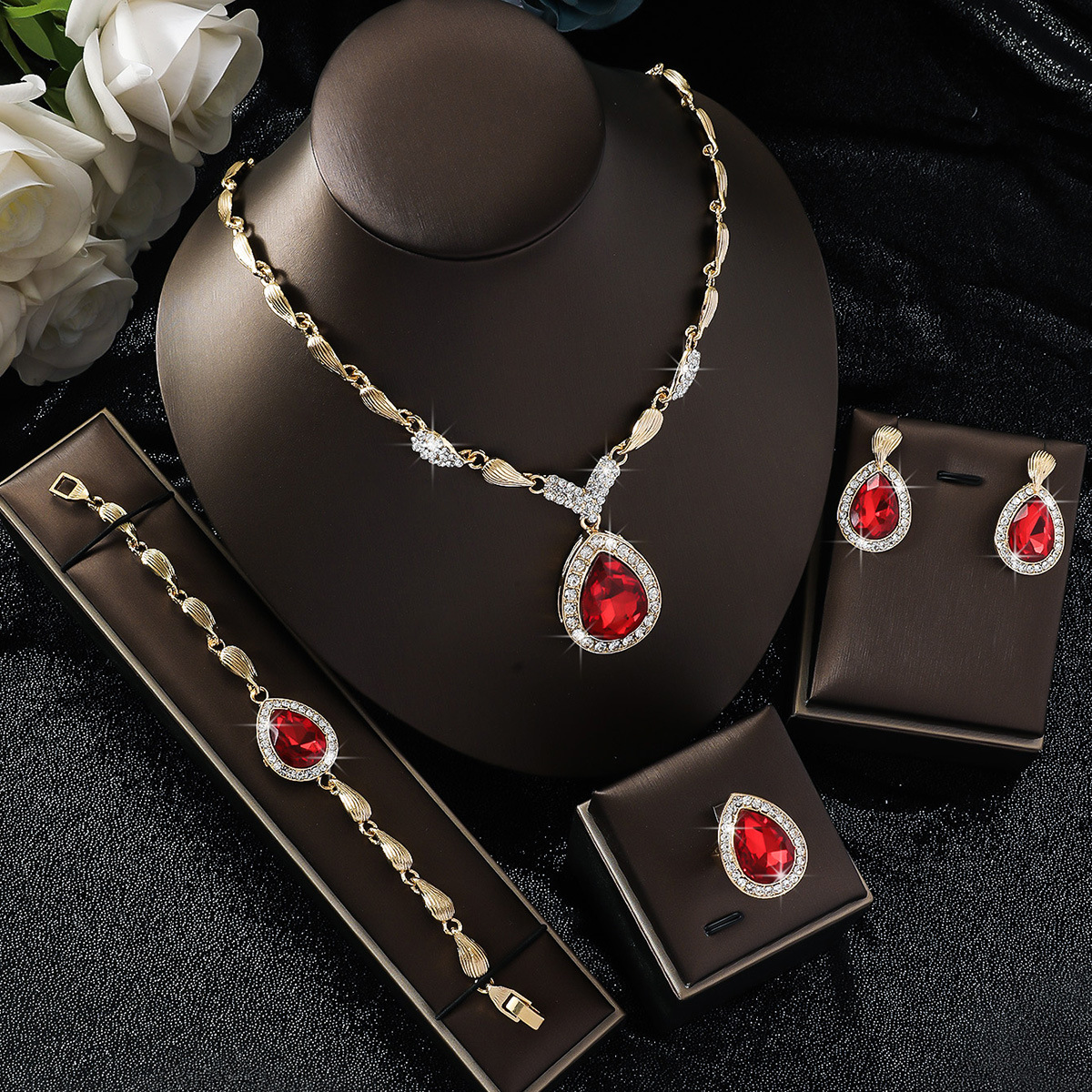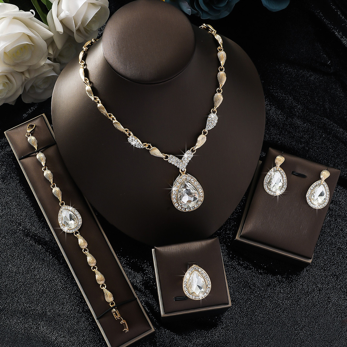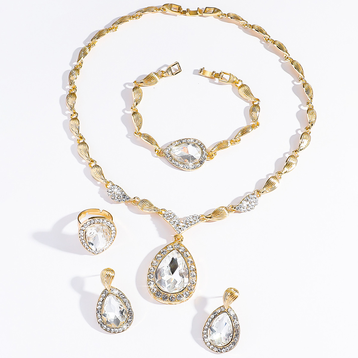 التجارة الخارجية الساخنة بيع انفجار مبالغ فيها قطرة ماء جوهرة الترقوة سلسلة سبيكة مطلية بالذهب أربعة قطعة مجموعة مجوهرات الزفاف بالجملة
