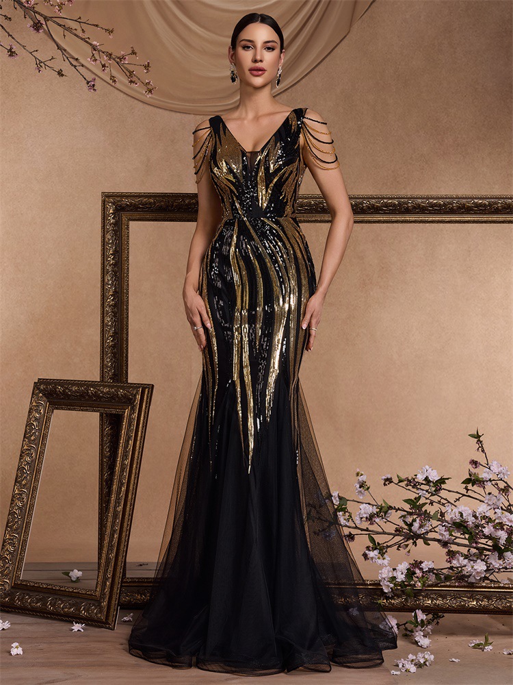 فستان سهرة أسود بتصميم ذيل السمكة، مزين بالخرز، بفتحة رقبة على شكل حرف V، وظهر على شكل حرف V، رائج بين نساء أوروبا وأمريكا.
