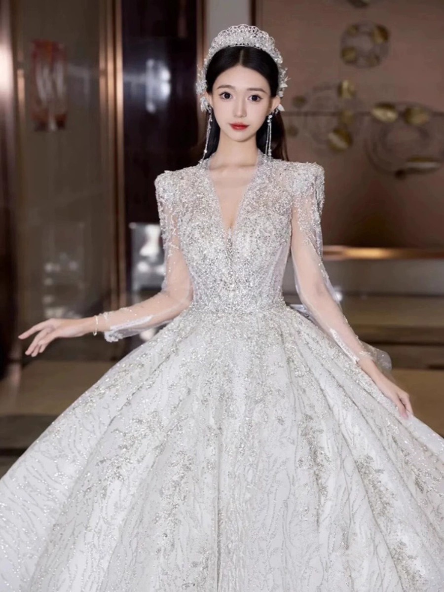 فستان زفاف فرنسي الطراز بفتحة صدر على شكل حرف V عميقة، موديل جديد لعام 2026، فستان زفاف أبيض فاخر بأكمام طويلة وذيل طويل