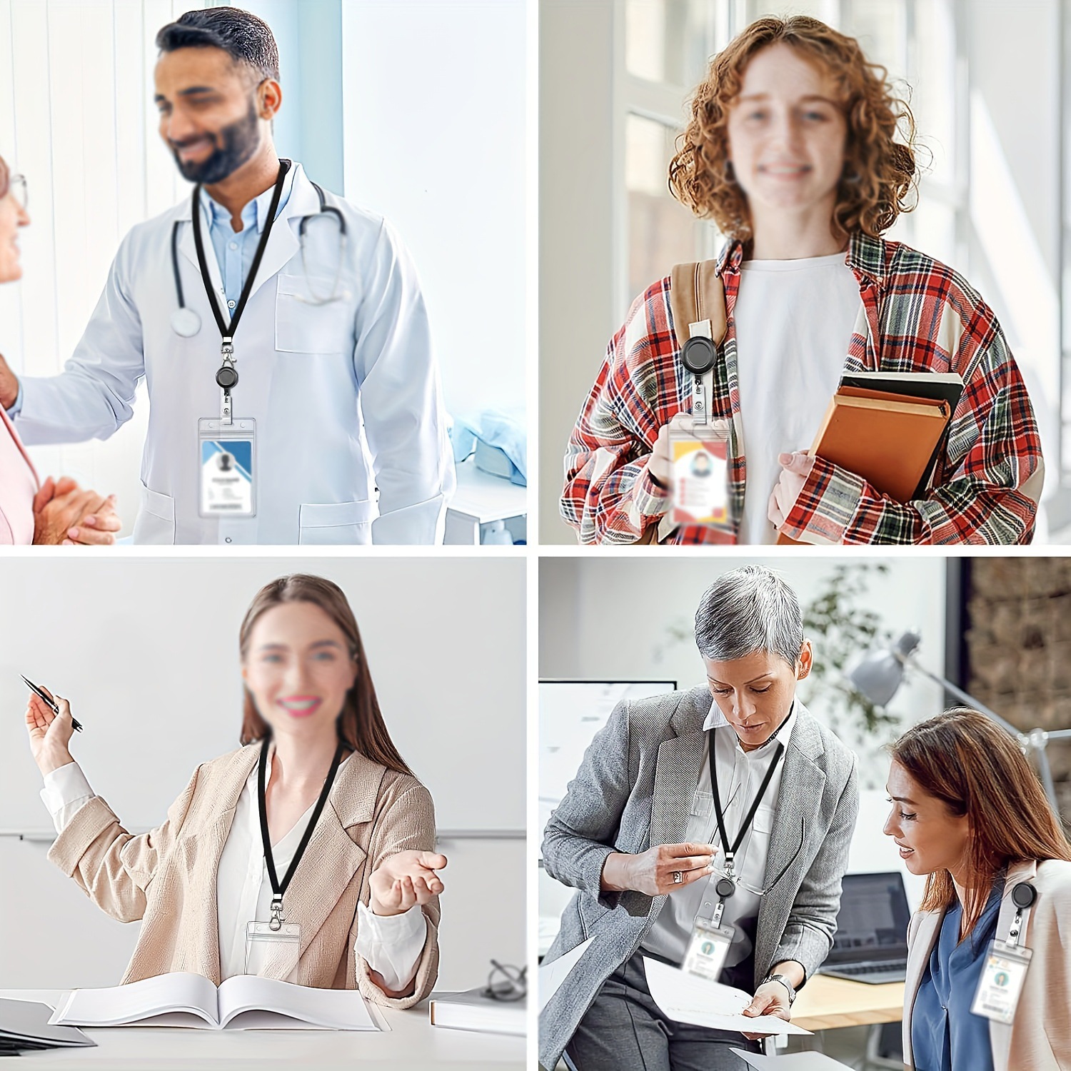 حامل بطاقة هوية من مادة PVC مع حبل تعليق أسود وإبزيم سهل السحب، قابل للتمدد وإبزيم شارة الصدر سهل السحب