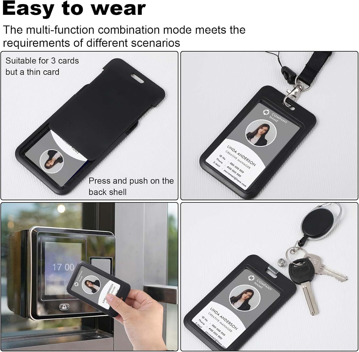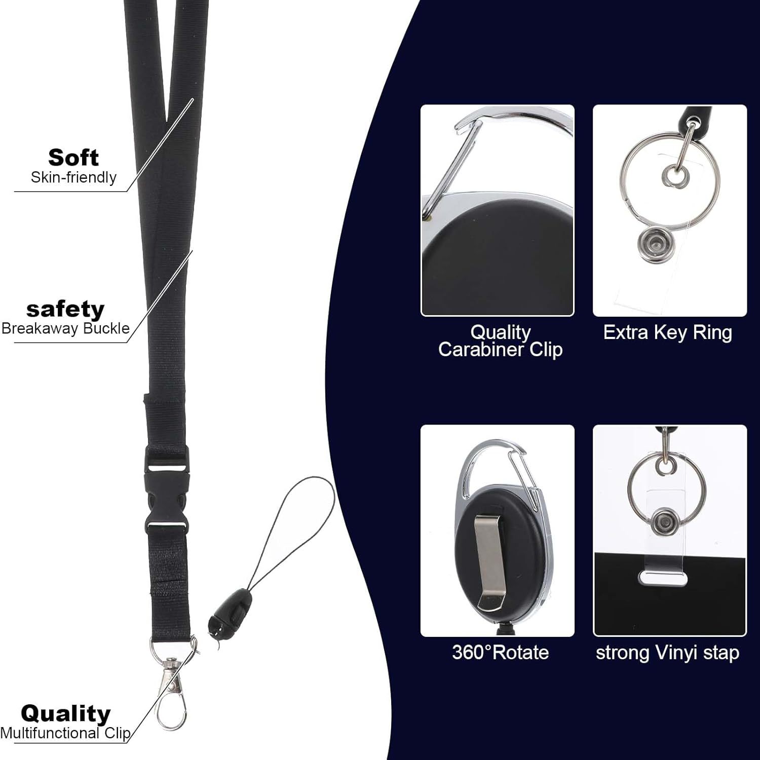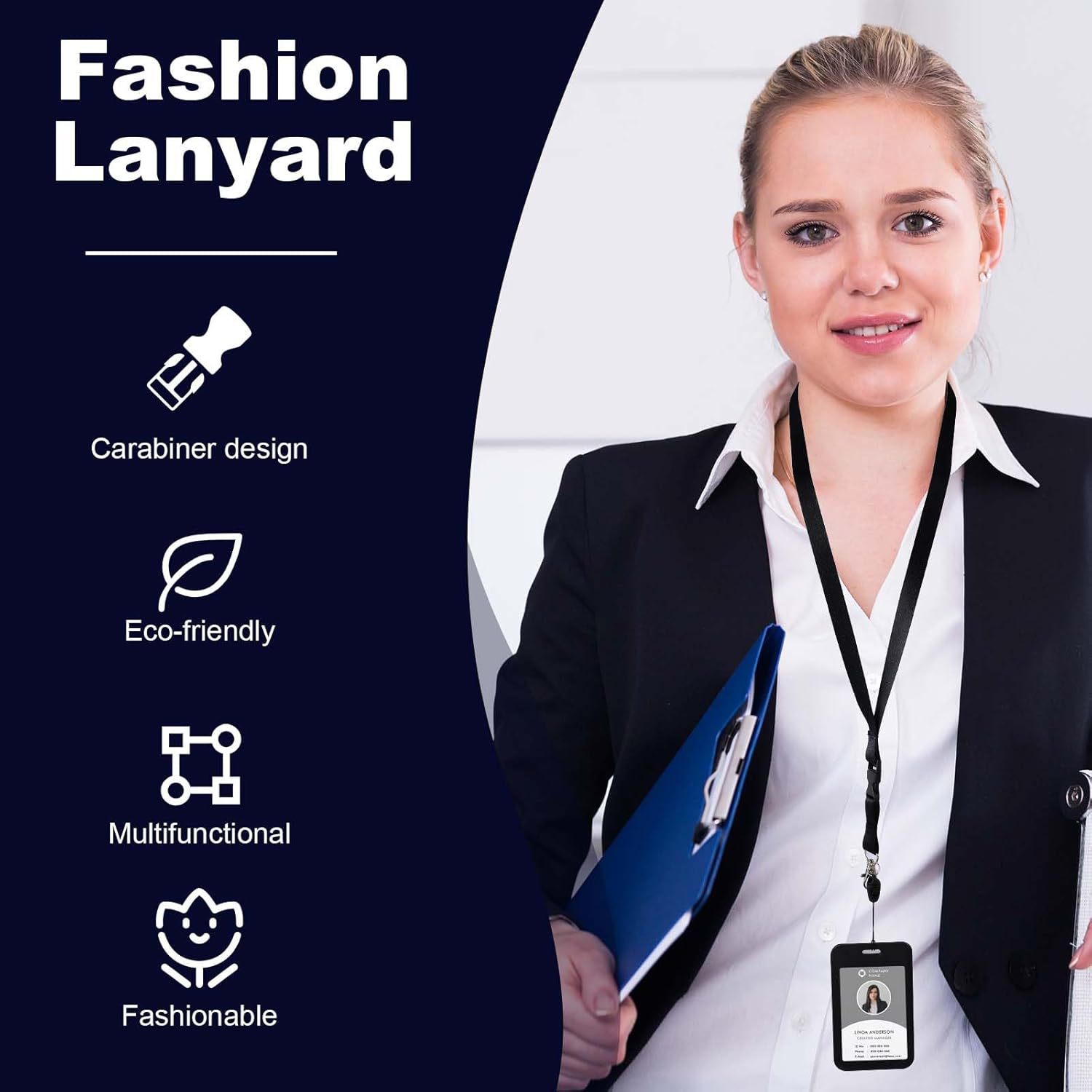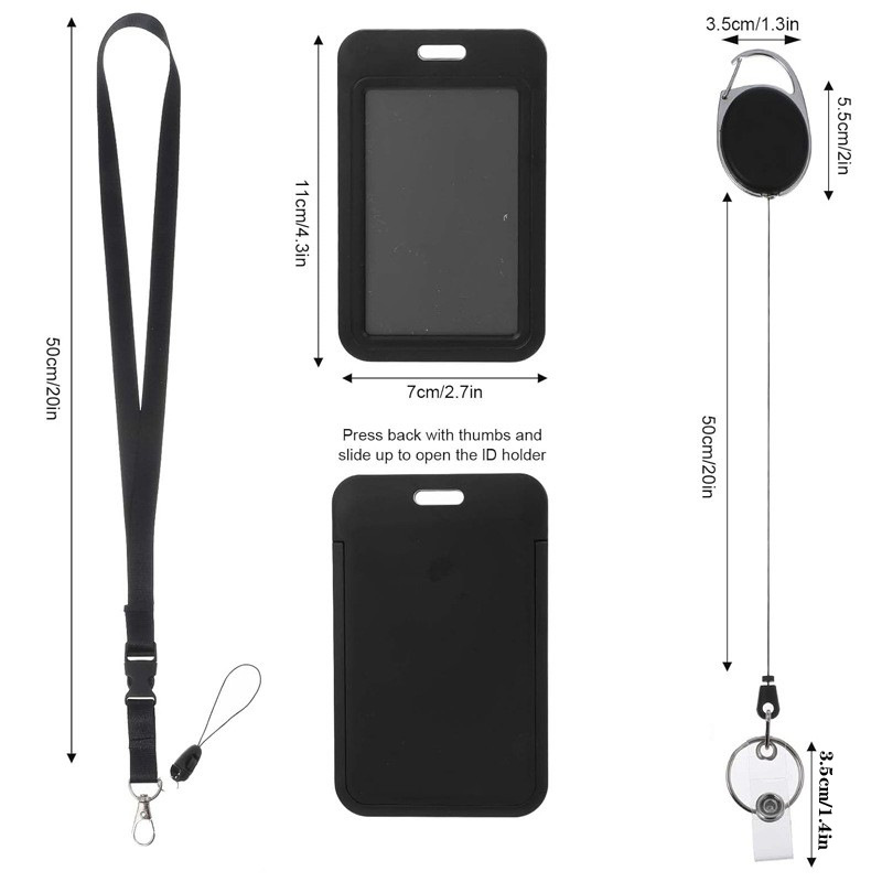 لفافة شارة مع مشبك قابل للتوسيع وسهل السحب، مشبك خلفي بيضاوي سهل السحب، غلاف بطاقة هوية عمودي، حبل تعليق للرقبة