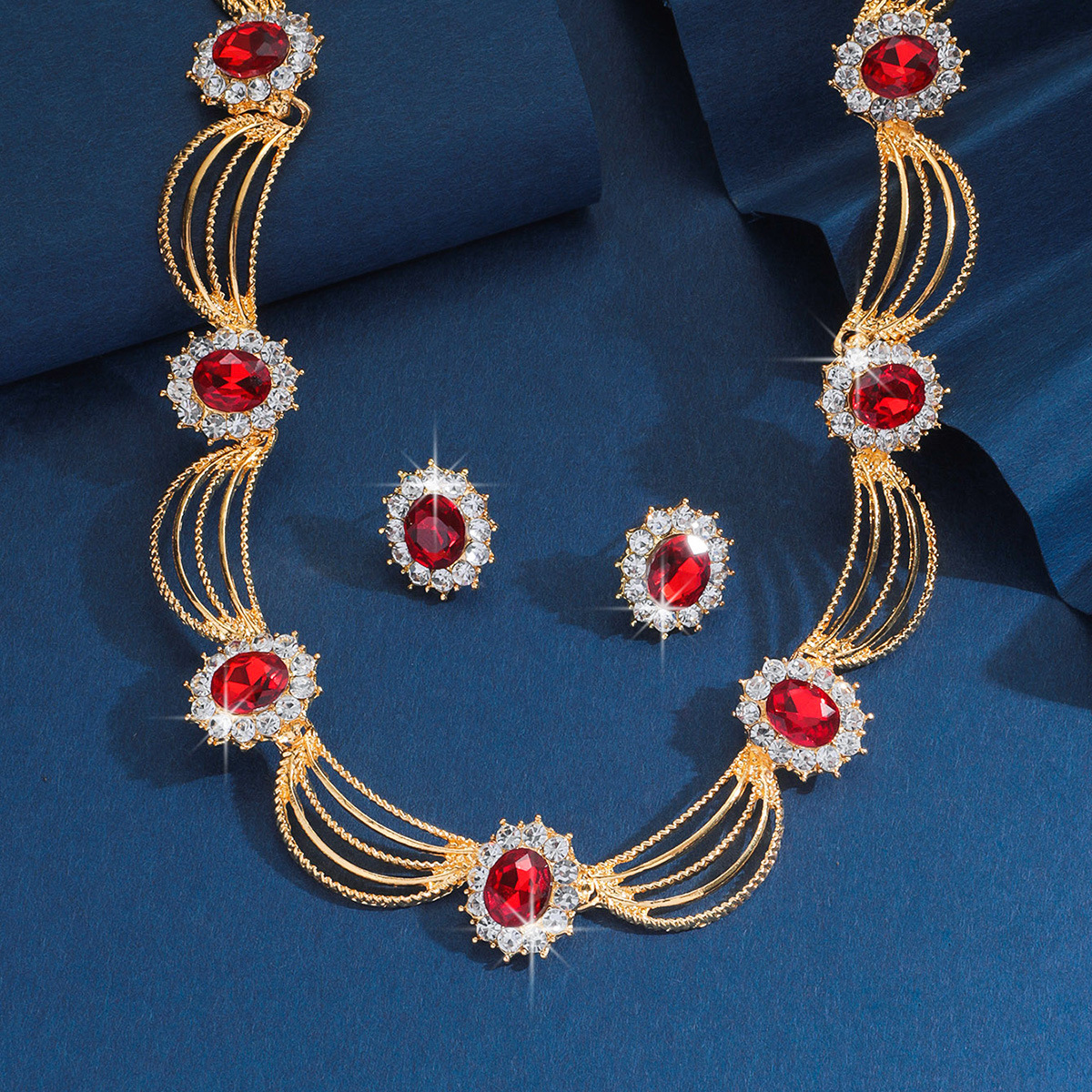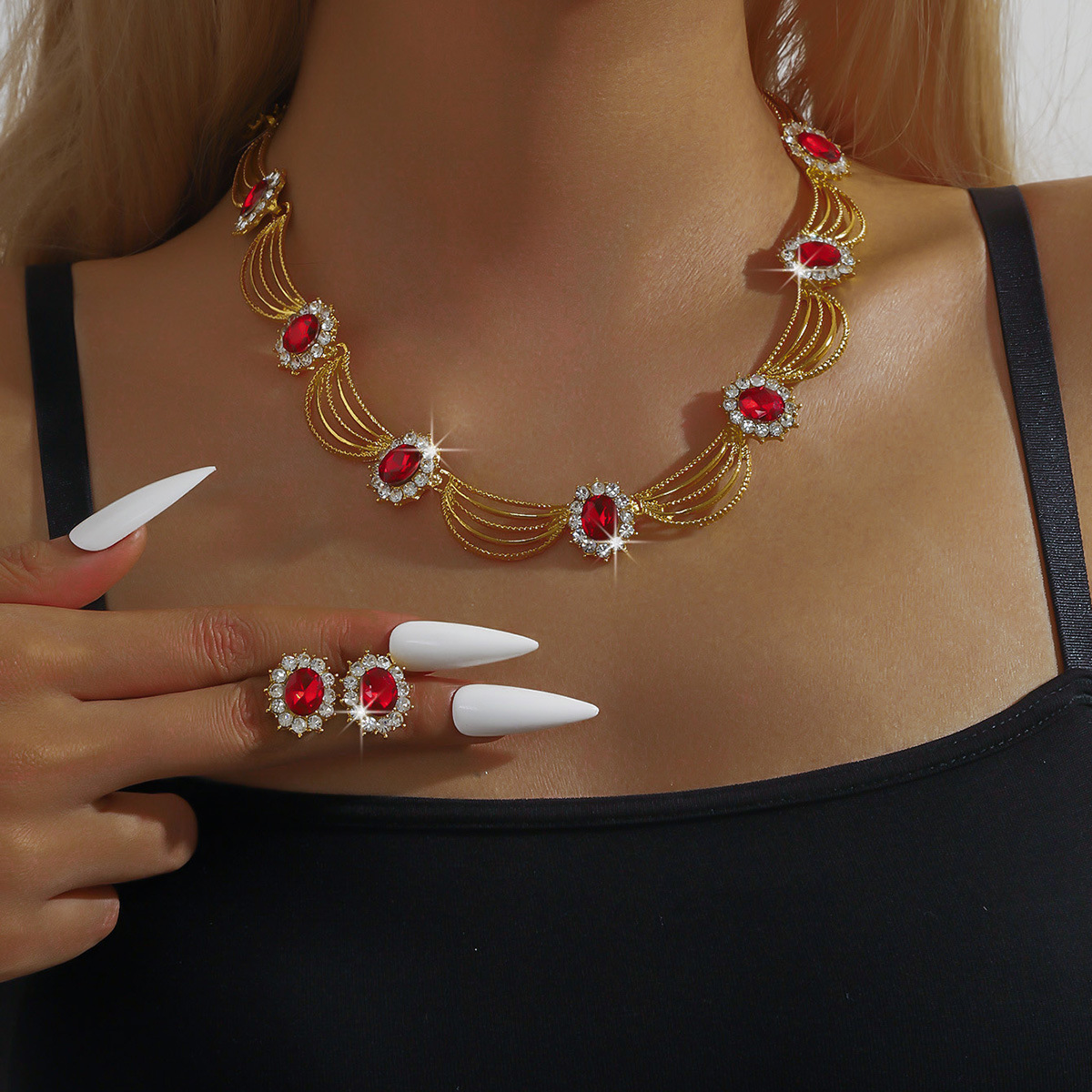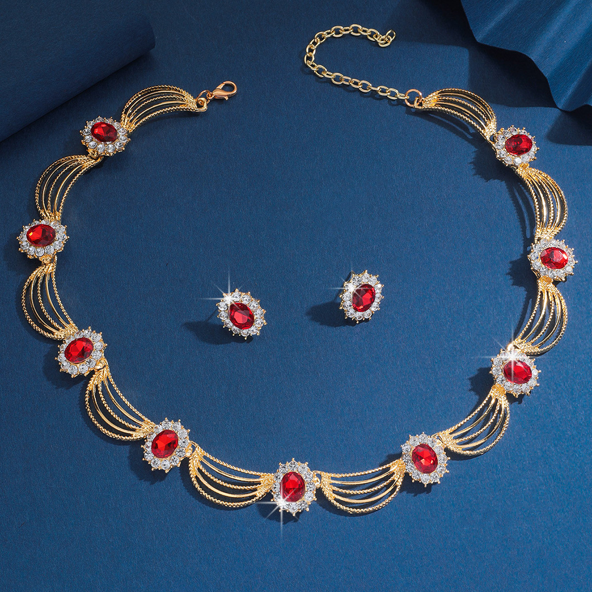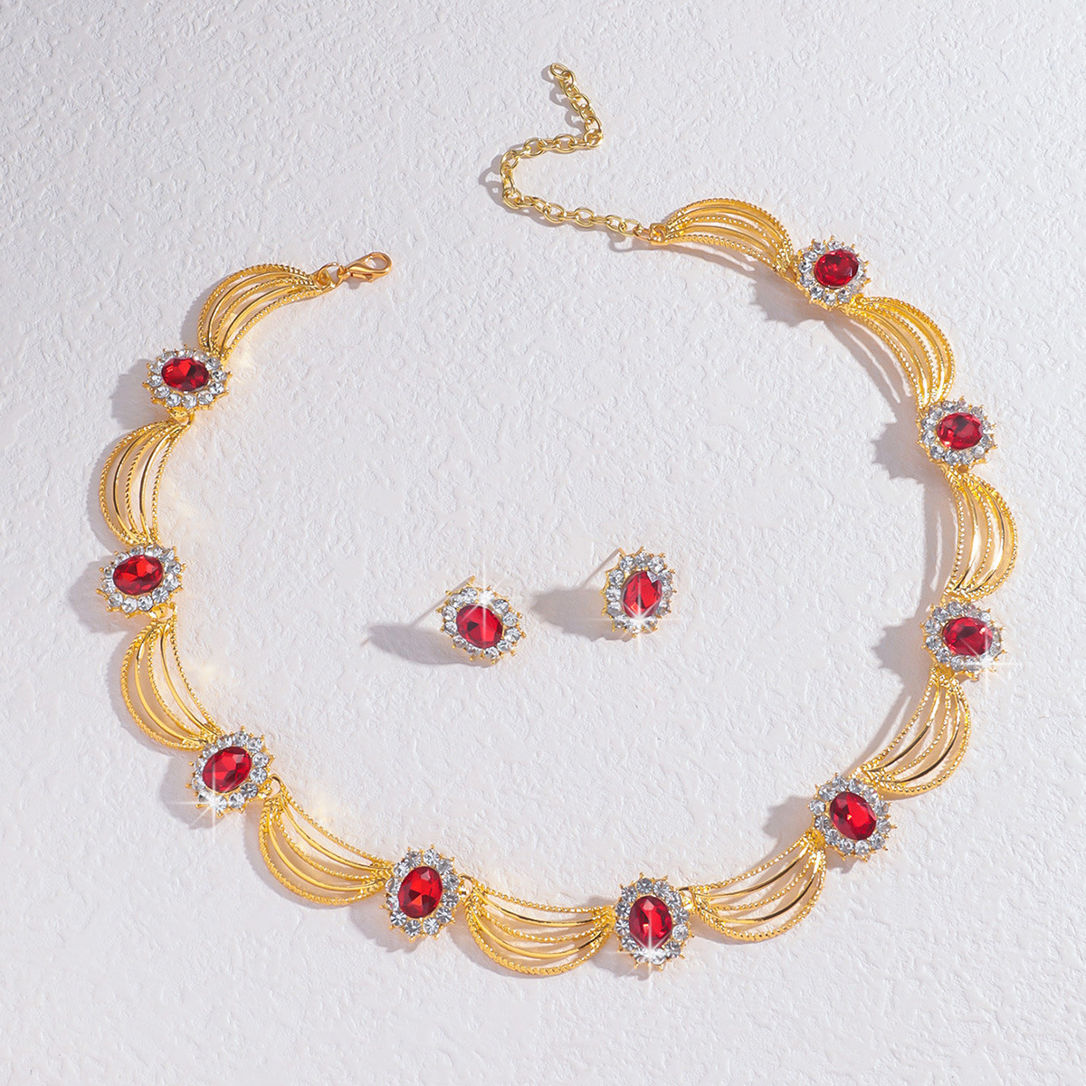 قصر الفن الرجعي مروحة جميلة على شكل شبكة الأحمر قلادة أقراط مجموعة انفجار الراقية في الغلاف الجوي سلسلة الترقوة