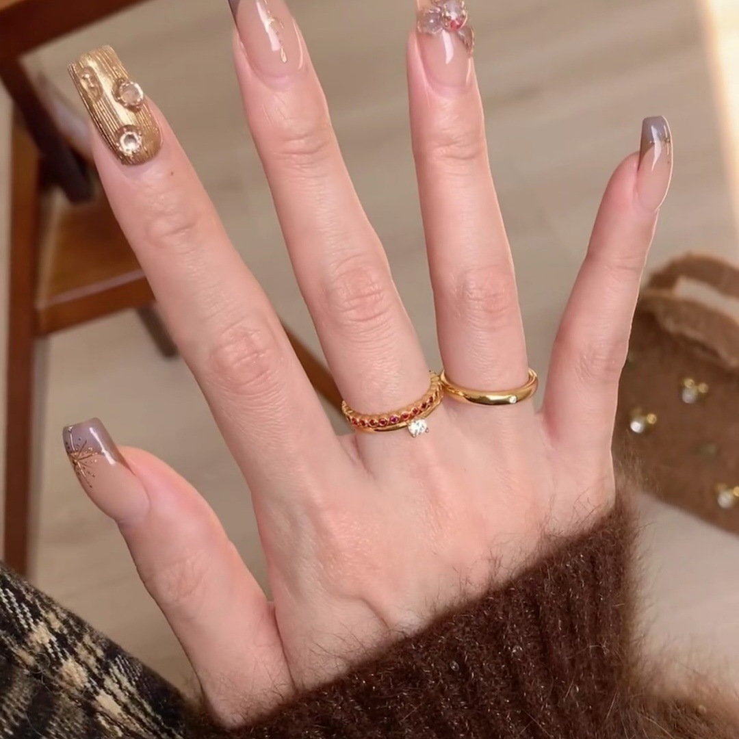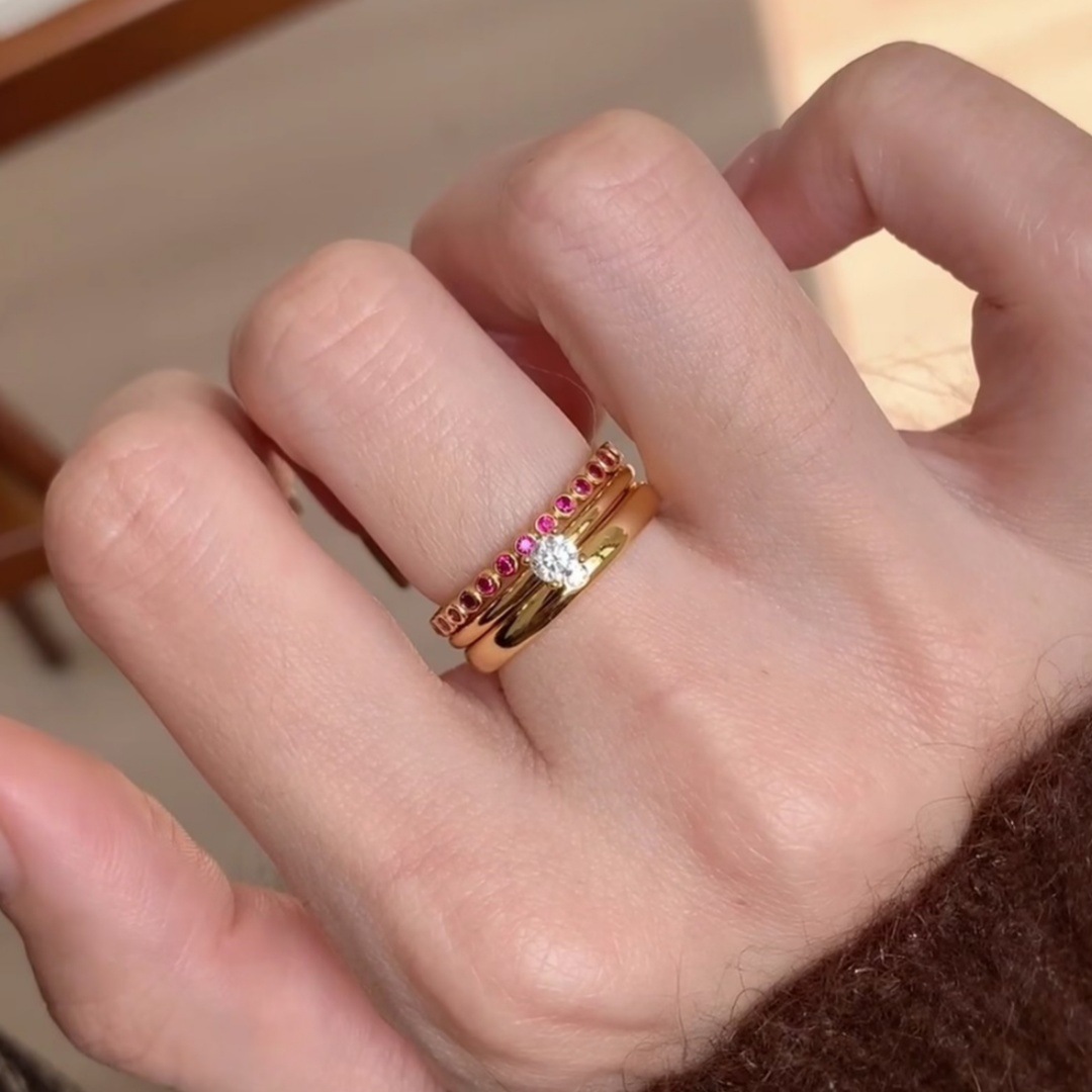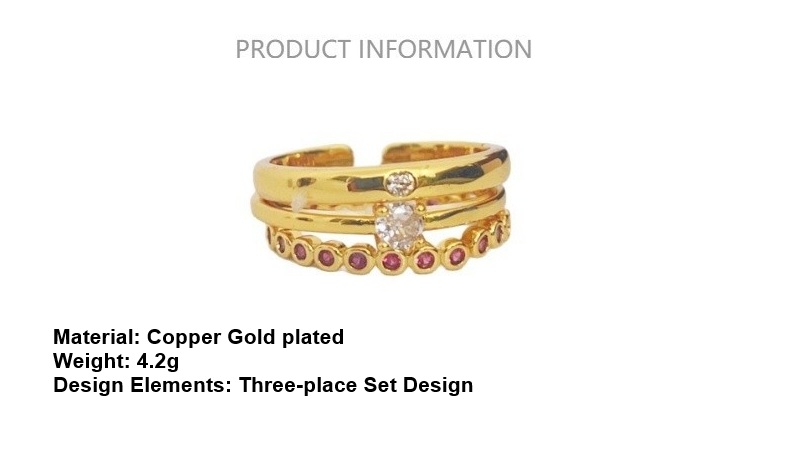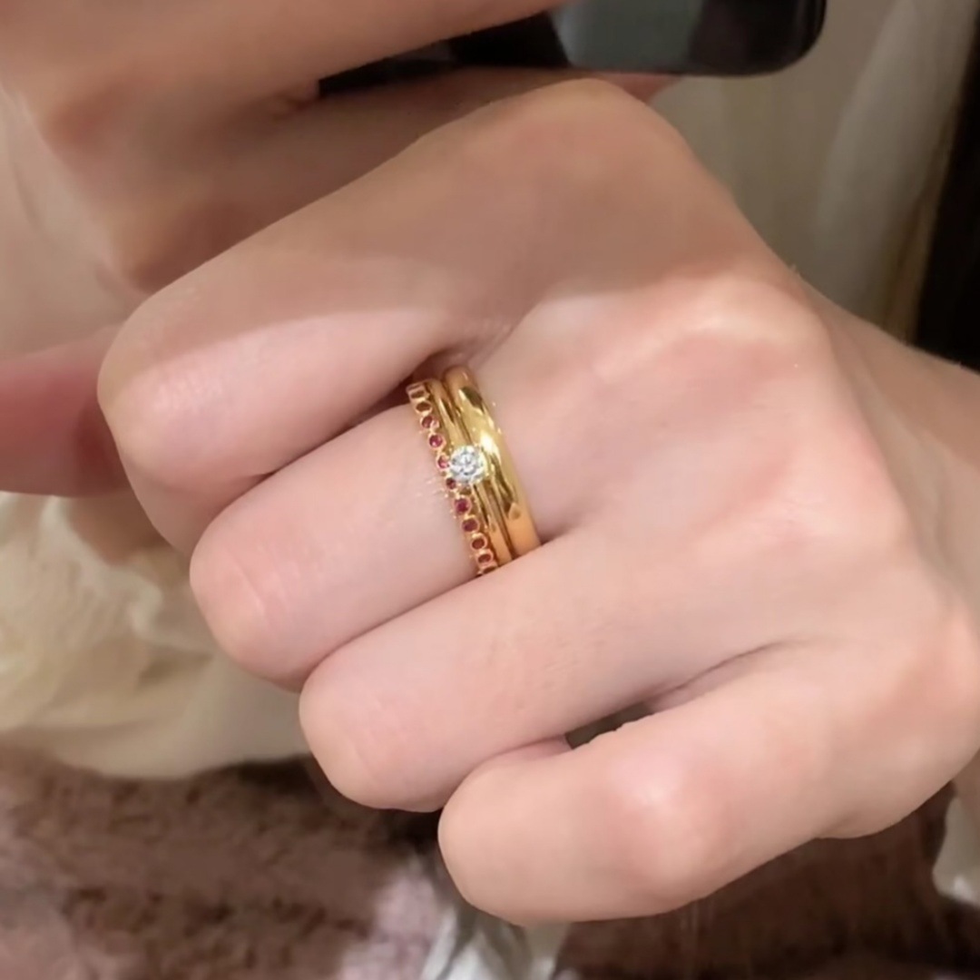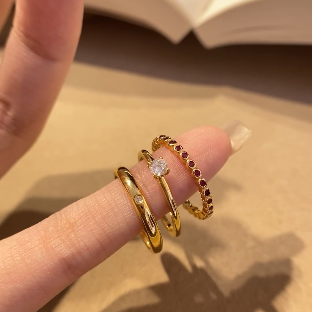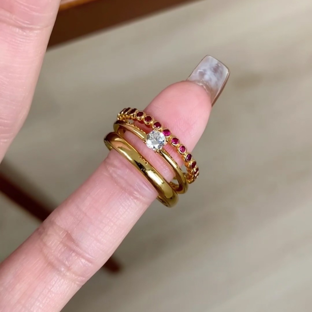 طقم من ثلاث قطع ~ خاتم ذهبي دائري مرصّع بنقاط ألماس حمراء ناعمة للنساء، ألماس متلألئ، صغير وعالي الجودة، خاتم كنز أحمر مكدس