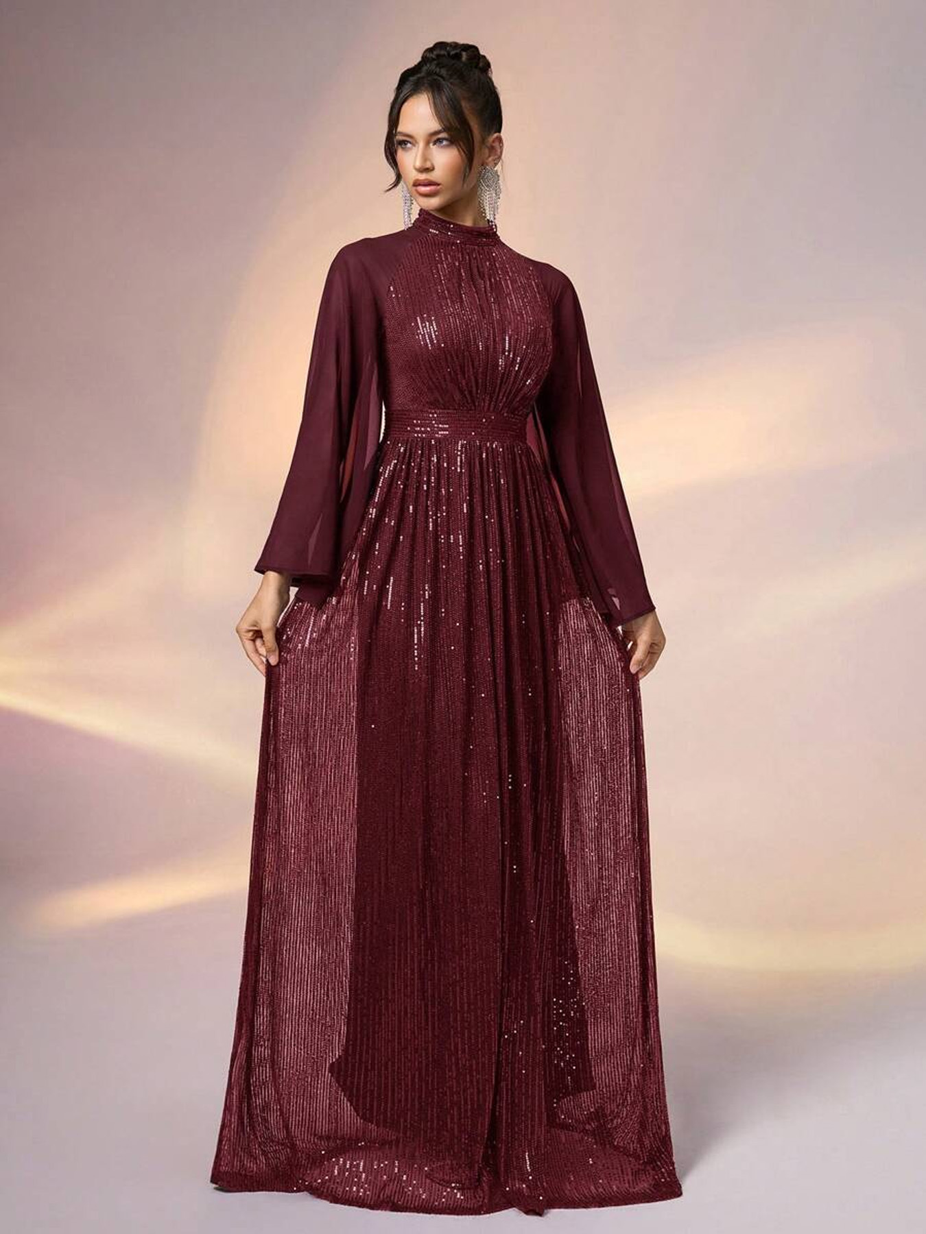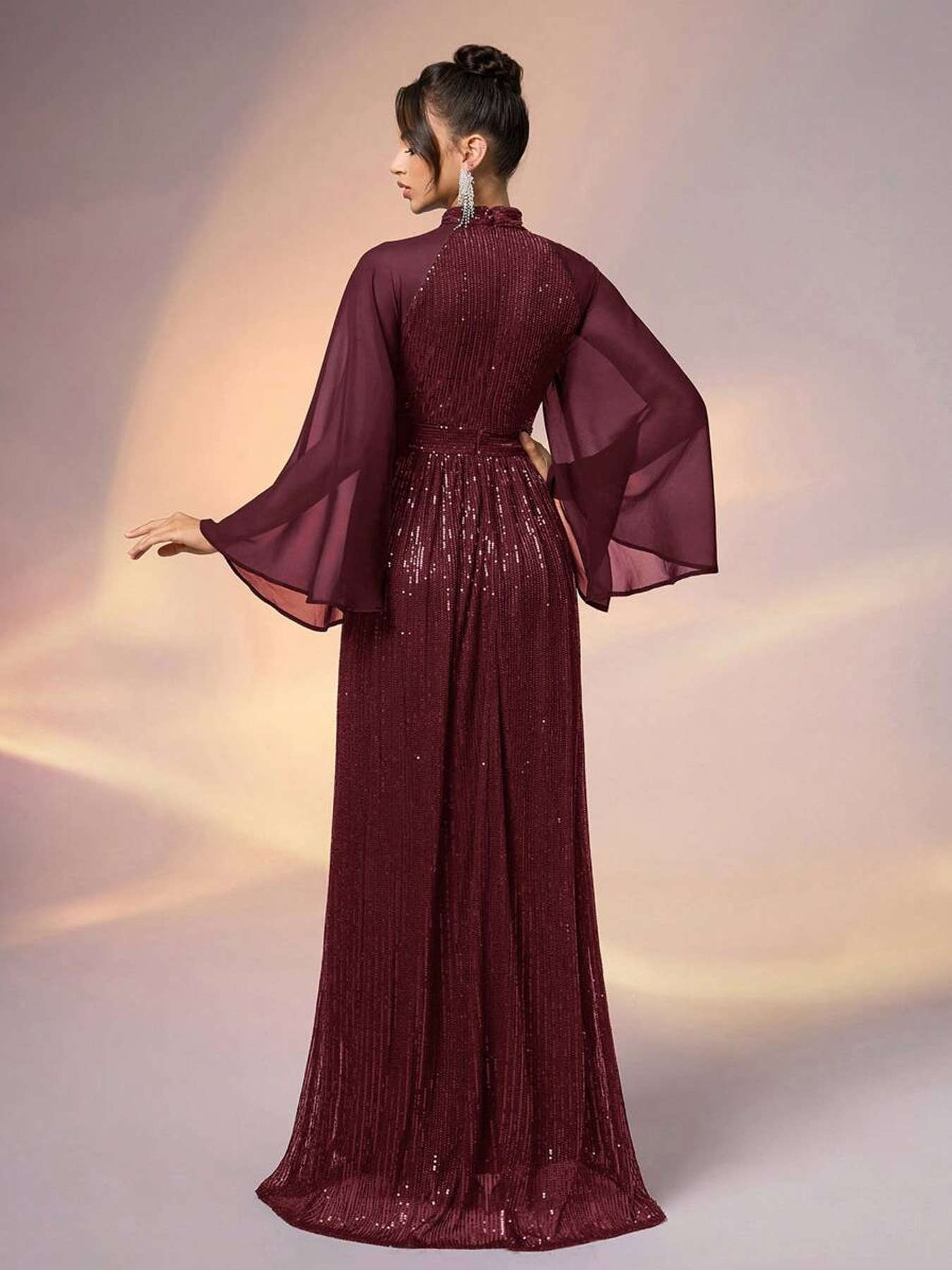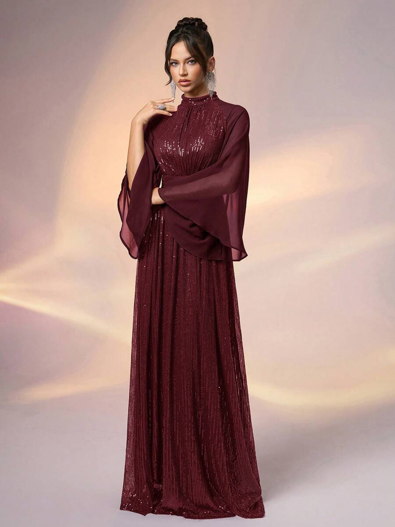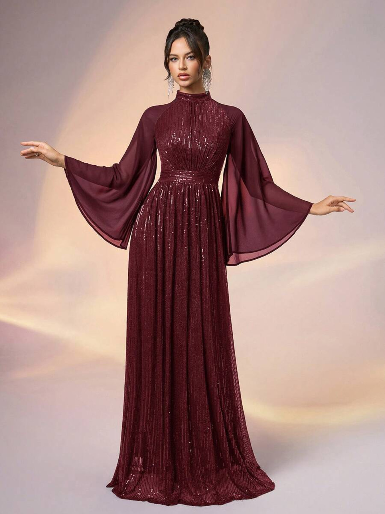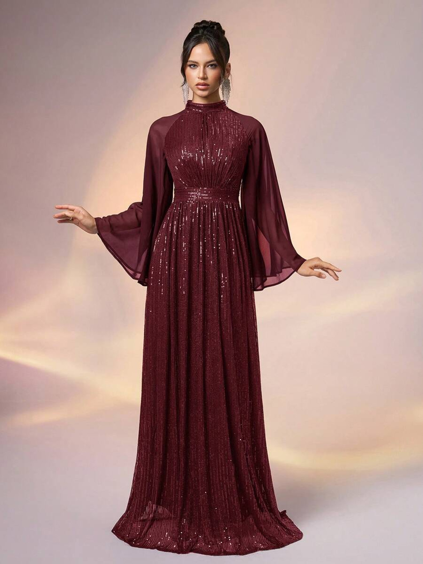 فستان سهرة طويل رسمي أنيق مستوحى من الطراز الفرنسي للنساء - برتقالي داكن/أحمر - فستان حفلات وحفلات الزفاف طويل بقصة واسعة على شكل حرف A مع لمعان شبيه بالترتر، حافة واسعة وياقة دائرية - قابل للغسل اليدوي لحفلات التخرج، والمهرجانات، والمناسبات الرسمية - فستان رسمي أنيق للنساء