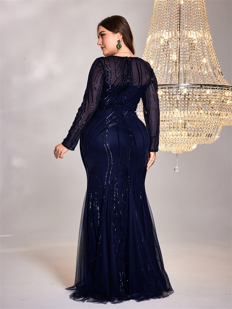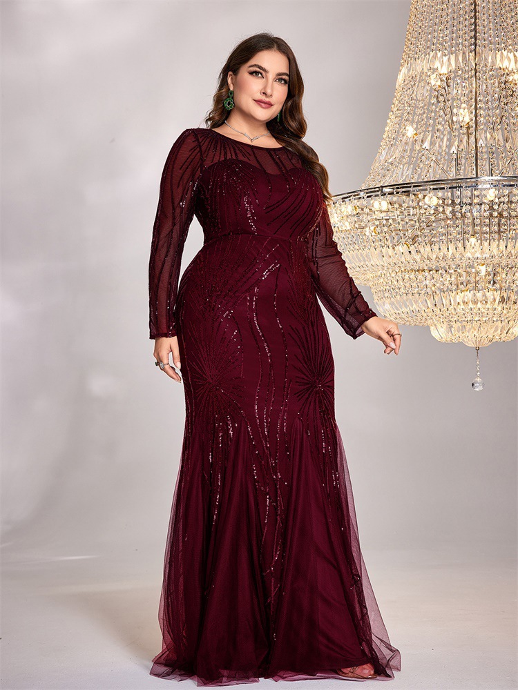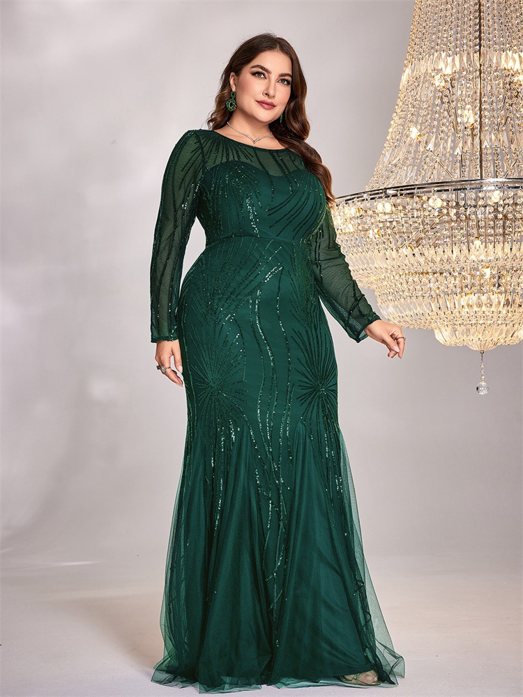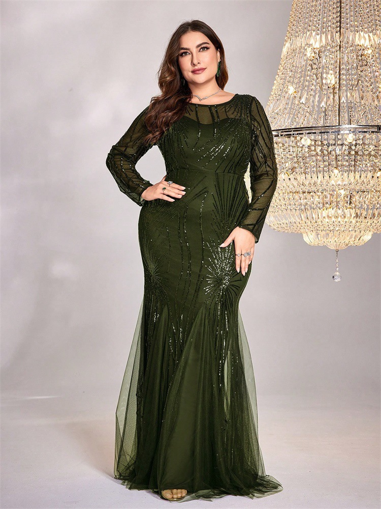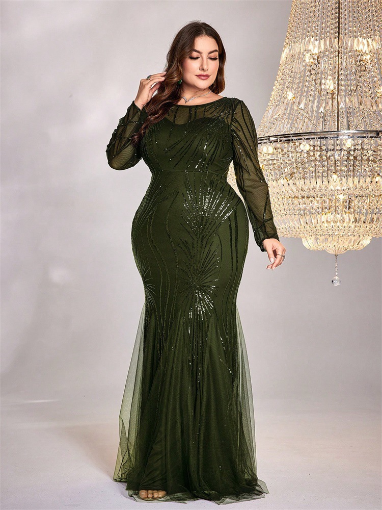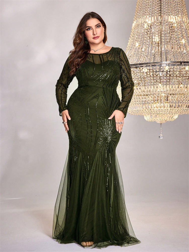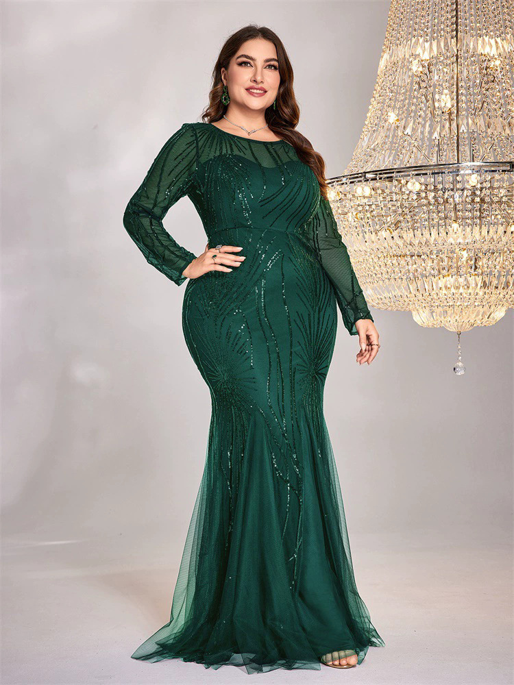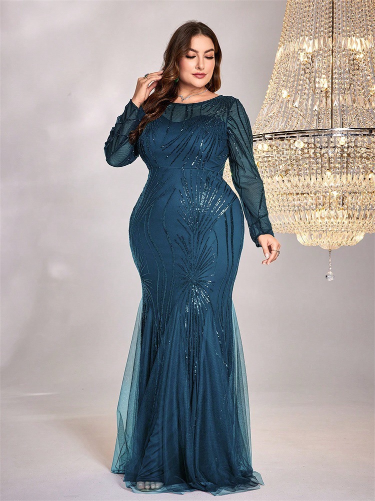 فستان جديد بمقاسات كبيرة مزين بالترتر، بياقة دائرية، بتصميم أنيق وقصة ضيقة وذيل سمكة، مناسب لوصيفات العروس، ولحفلات الزفاف والمناسبات المسائية.