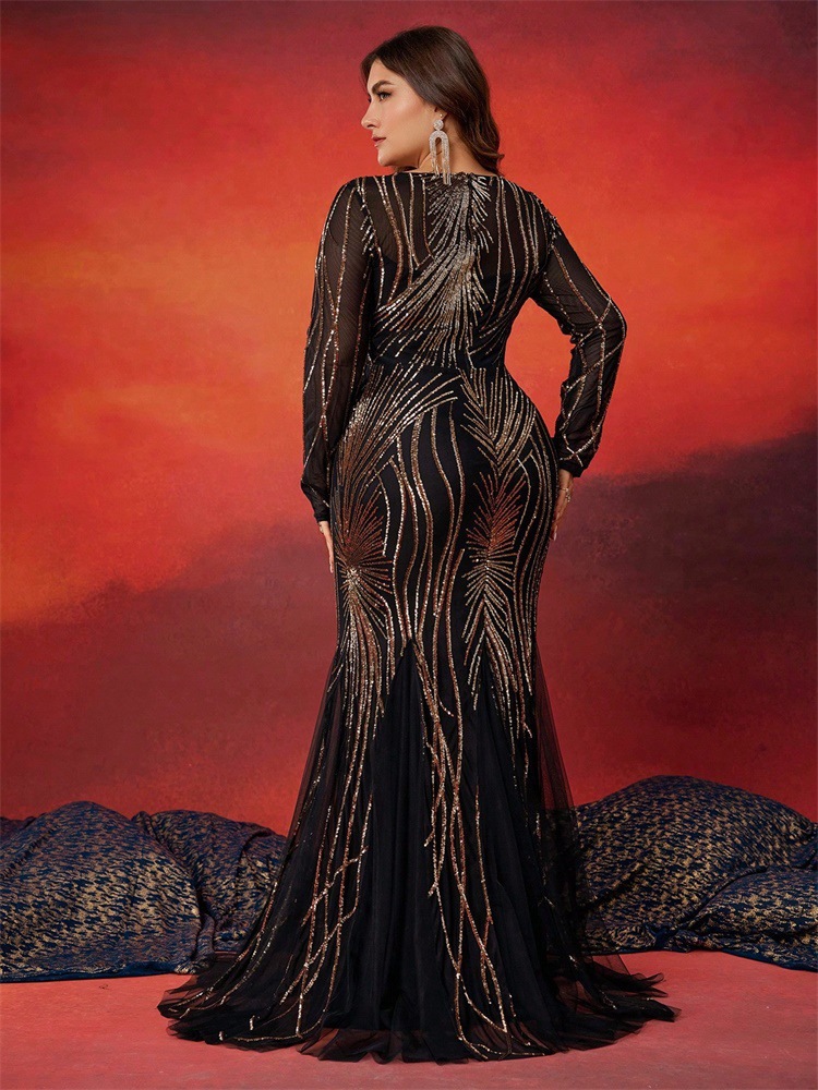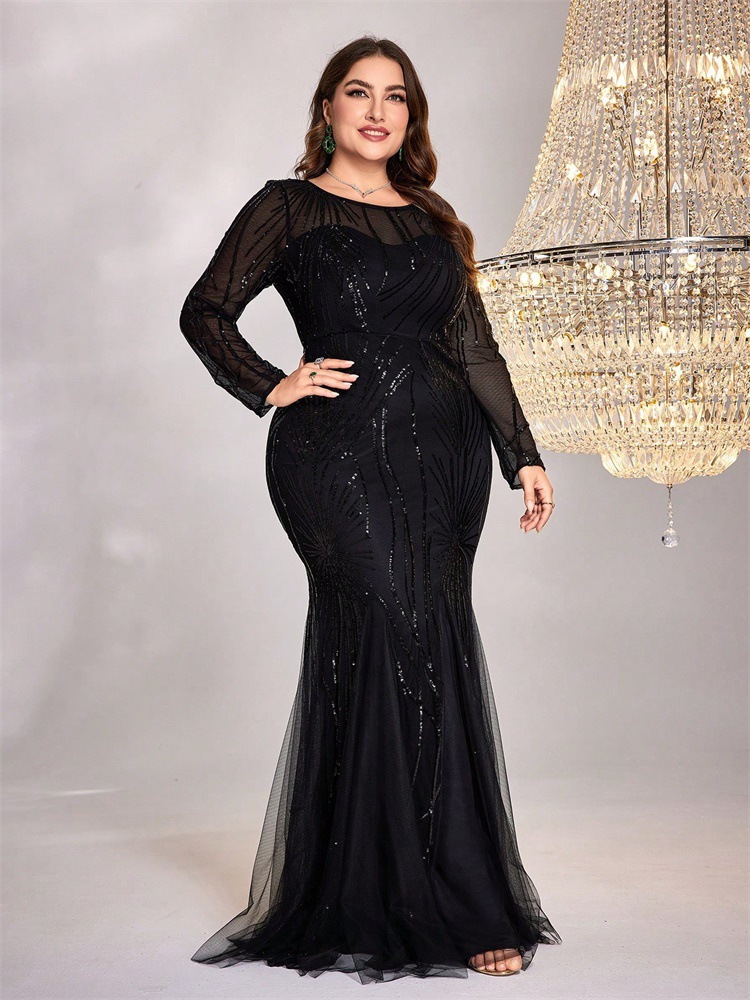 فستان بمقاسات كبيرة مزين بالترتر وتطريز شبكي